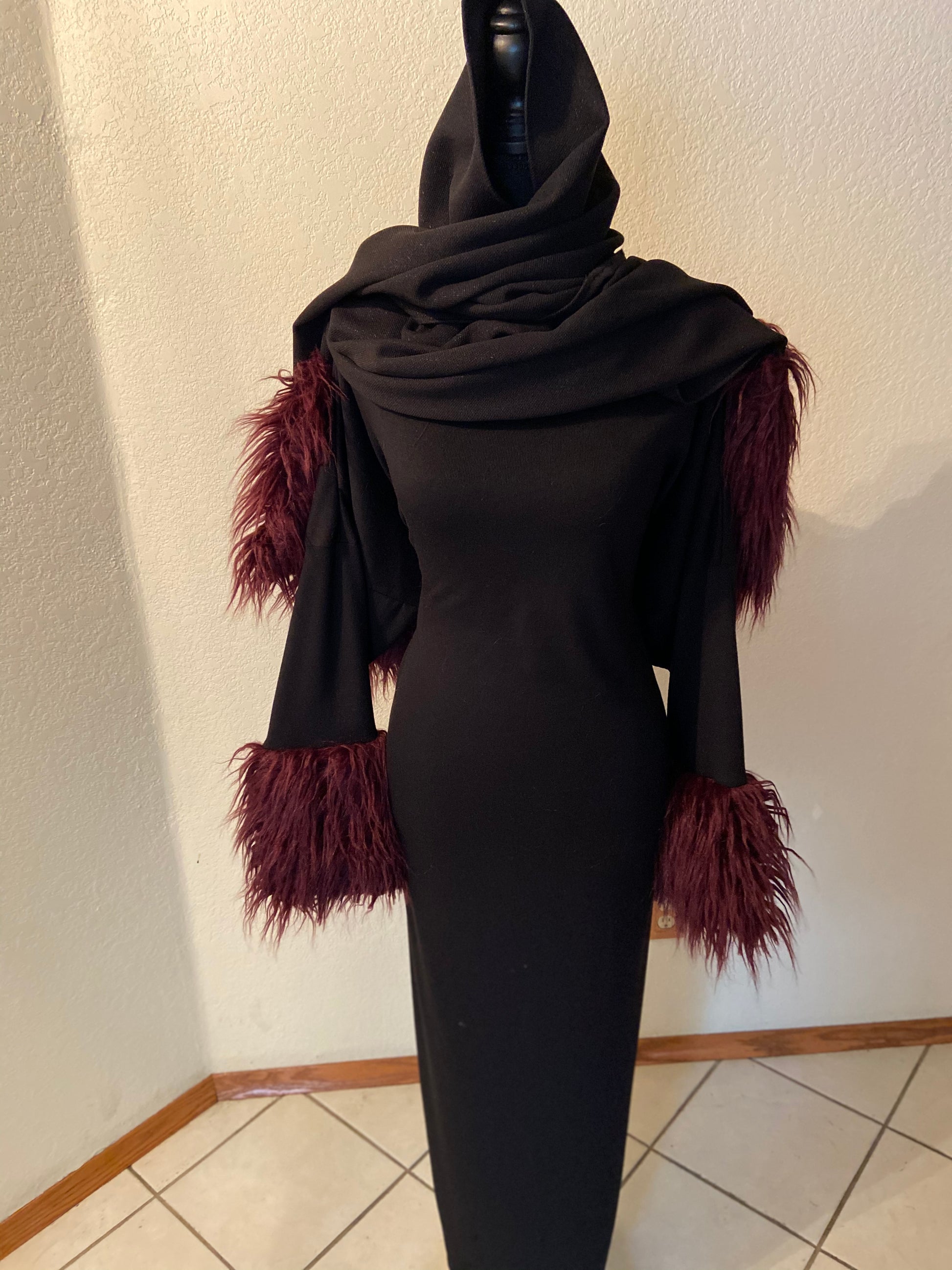 Norahs Khan Dress Ensemble has a Wrap Compliment trimmed with Vegan ( Faux Fur). Your distinctive attitude just went up a few notches when you step out in this sophisticated custom style. Long sleeves twin trimmed. Black Dress is straight cut stretch knit fabric with ankle length hemline. The Back Wrap is versatile to style many ways..... Over shoulder or around shoulders. Top off with your bold jewelry, clutch purse, boots or heels and take over with confidence. This is a custom design, kindly provide your dress size or measurements in note section at checkout. If you desire other colors for dress or trim ... consult with Designer, Norahs... Happy to assist you further. All Sales Are Final.