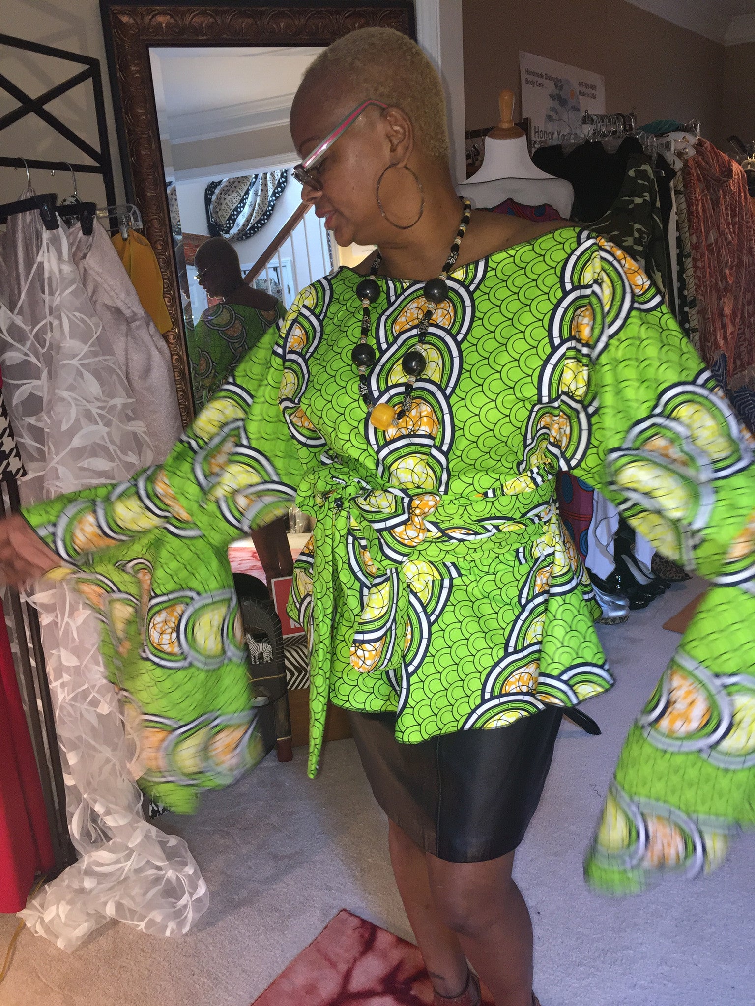 Norahs Khan Design African Print Top is all about distinction with the butterfly sleeves and bright colors. Off shoulder neckline. Wrap belt attached. Fits size medium/large