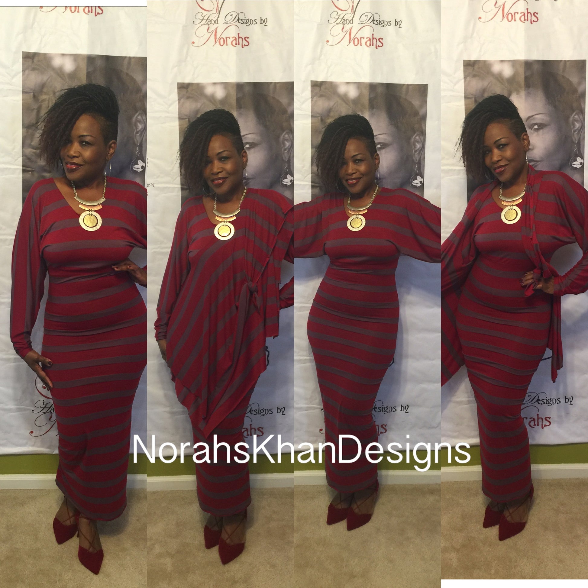 Norahs Khan Design Burgundy Stripe Dress has matching Vest. Dolman Sleeves adds to this bold design. Style matching vest different ways gives you versatility. Soft jersey knit fabric fits your curves. Easy Wear and Care. Perfect travel garment. Fit Size Small/Medium