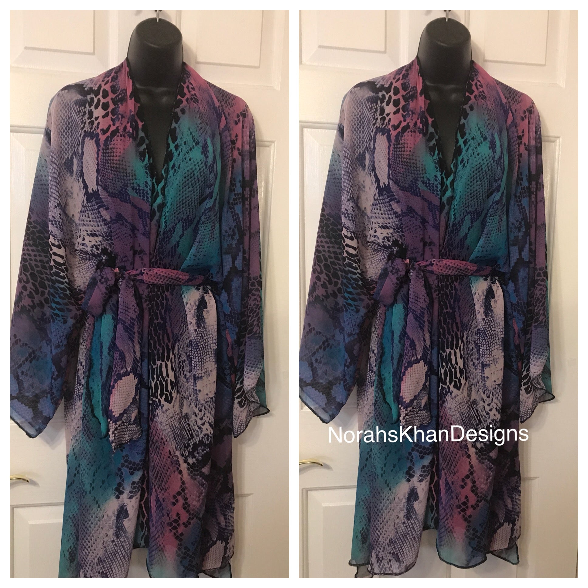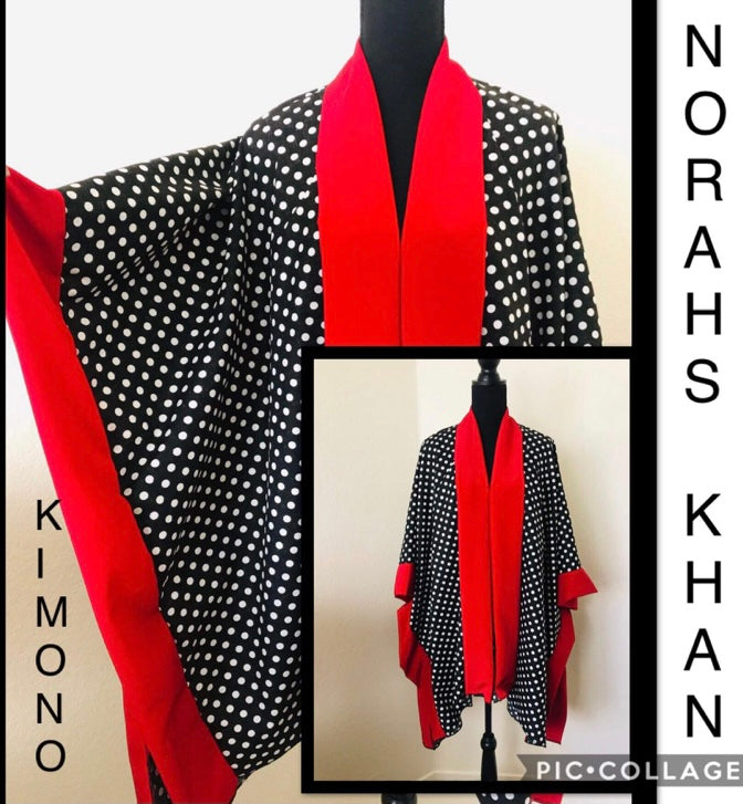 NK Short Kimono has full sleeves and matching belt. Various Colors.and Prints Available. Designer will use inventory fabric. Serged Edges. Style as top over legging, shorts, skirt, swimwear, cruise wear, model robe. Fit Small Medium Large. XLarge Made Upon Request. See home Page for Turn Around Policy
