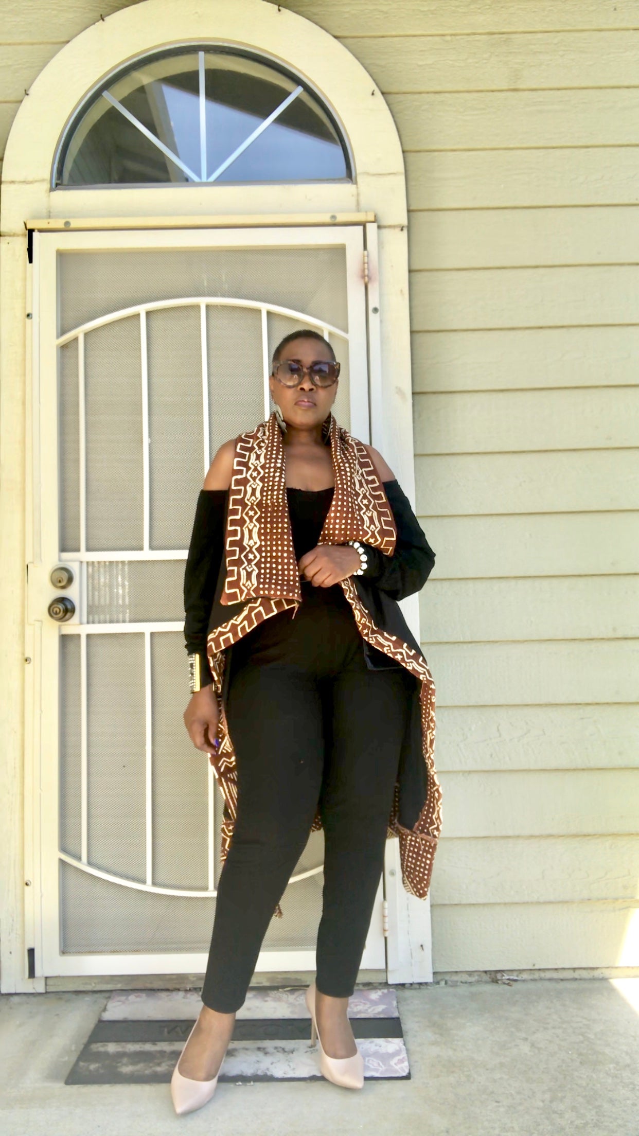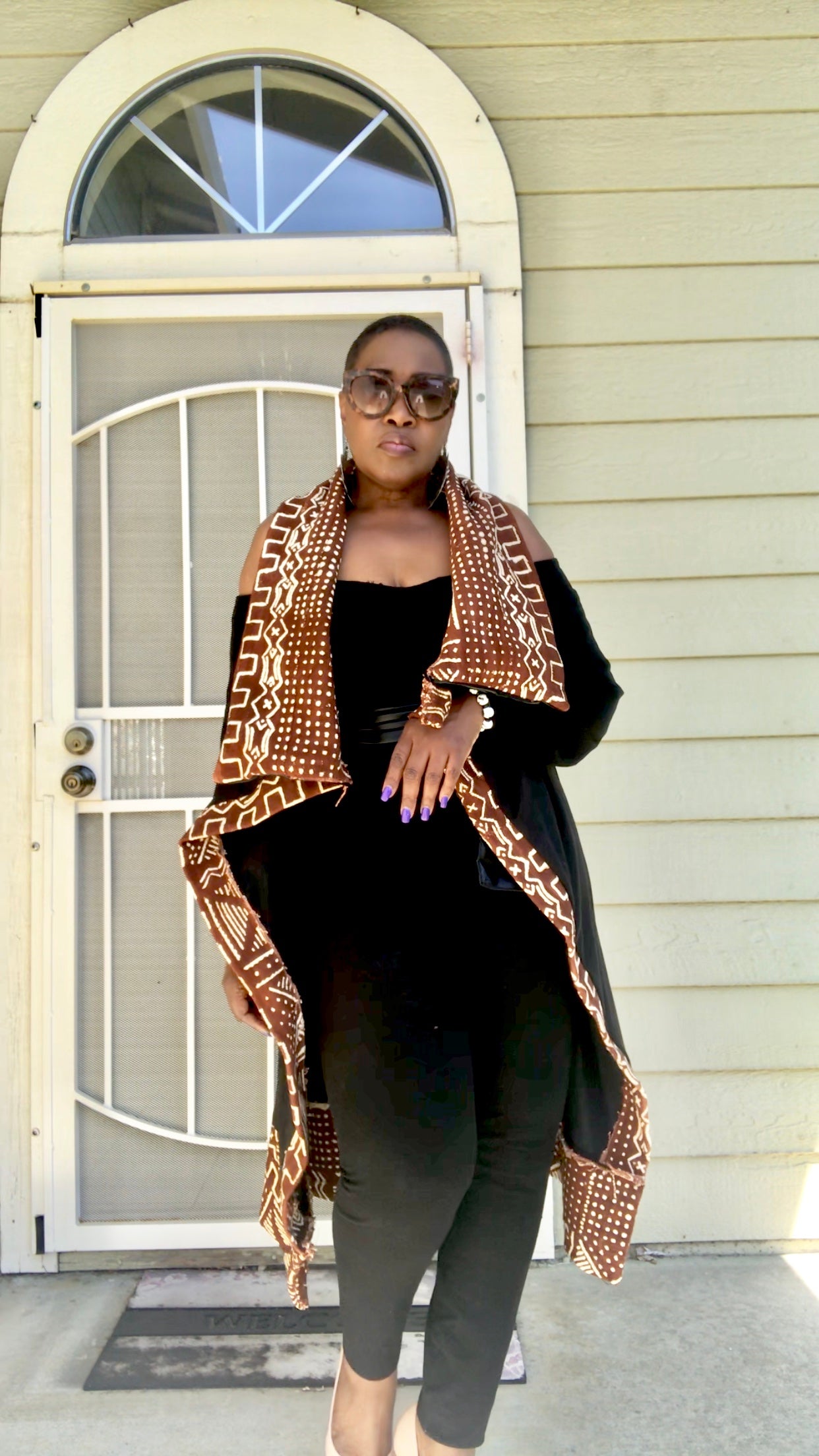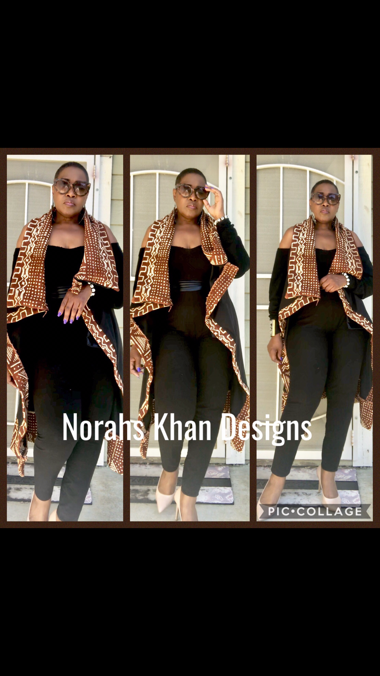 Norahs Khan Signature Vest is Trimmed with Stylish Bold Fabric Options Of Various Colors that may include MudCloth upon your special request. Wide collar with matching trimmed sides compliments base of vest with wide arm holes. Wear with your NKD Jumper ( Sold separate) or leggings for a distinctive fashion statement Provide color preference in note section for your custom design. Allow time to make. Email notification is sent when shipped. ALL SALES FINAL....